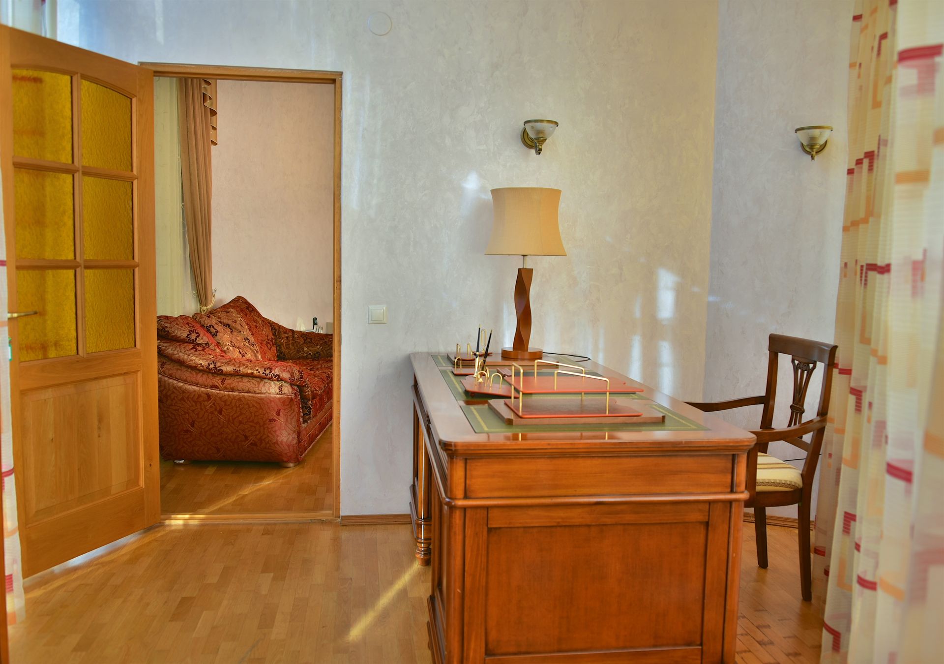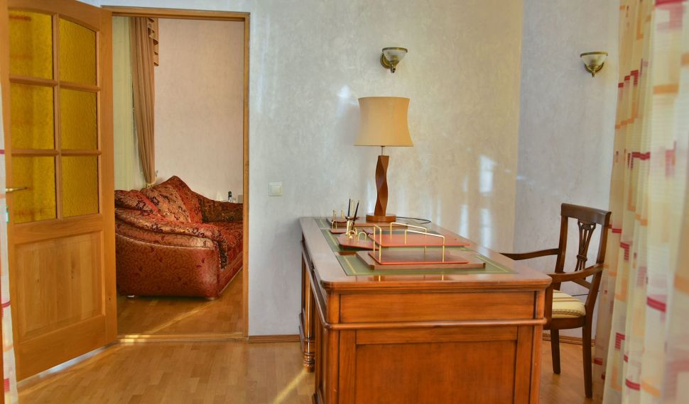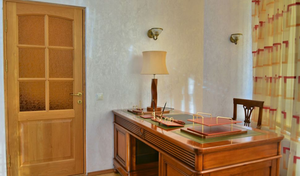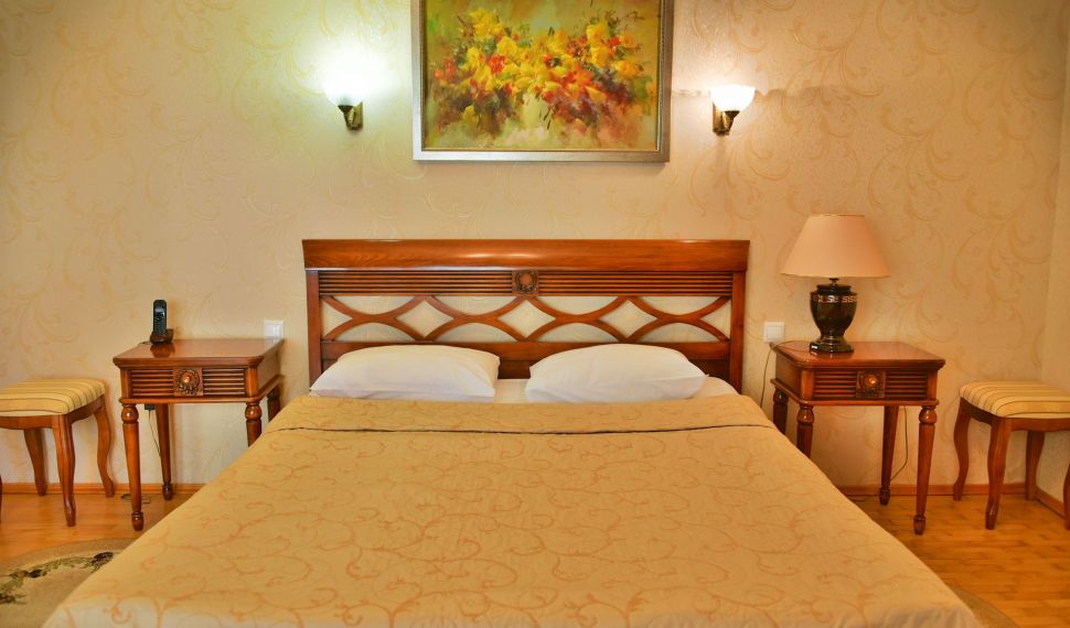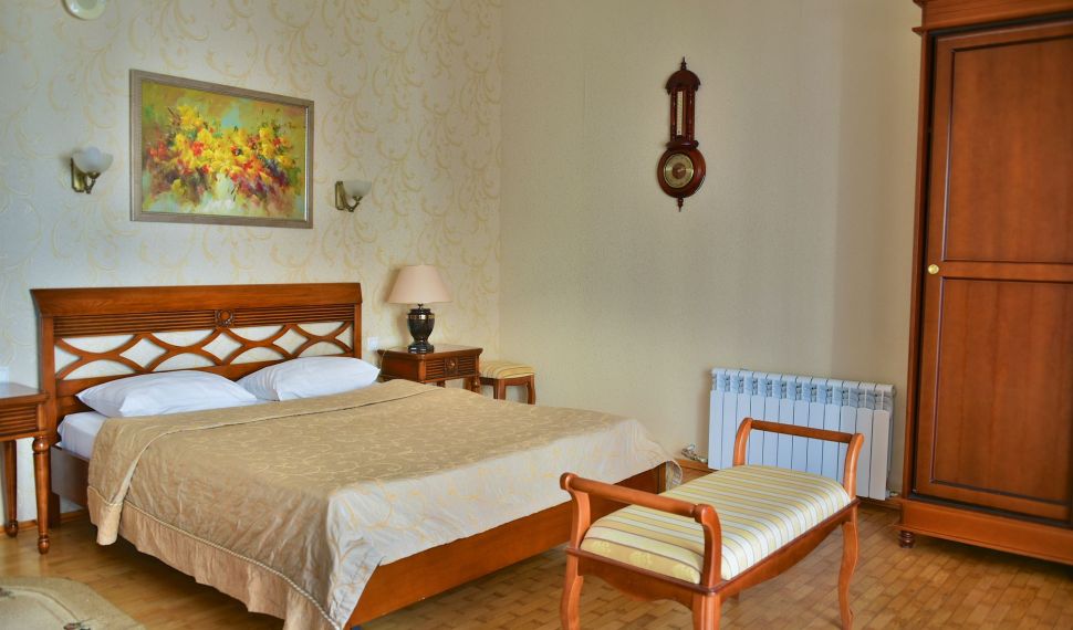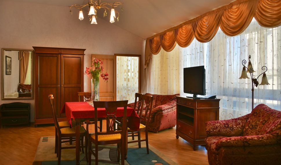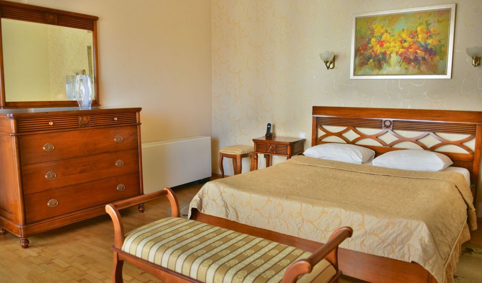 Просторный двухкомнатный номер, оснащен мягкой мебелью. В гостиной: диван и два кресла, журнальный столик, стол со стульями, TV, сейф. В спальной комнате: французская кровать с прикроватными тумбочками, туалетный столик с зеркалом, банкетка, шкаф. Ванная комната: большая ванна, фен, набор косметических средств. В номере имеется кабинет: письменный стол, настольная лампа, стул, шкаф для книг.