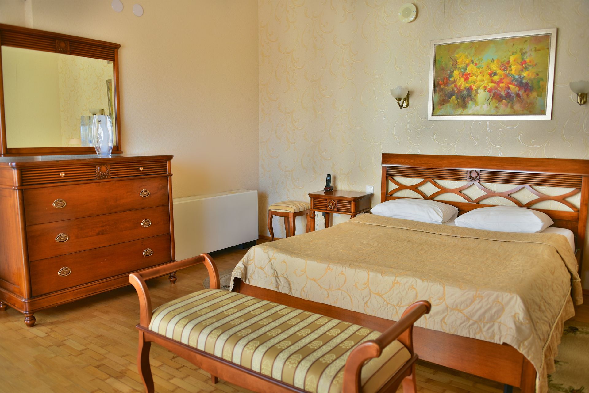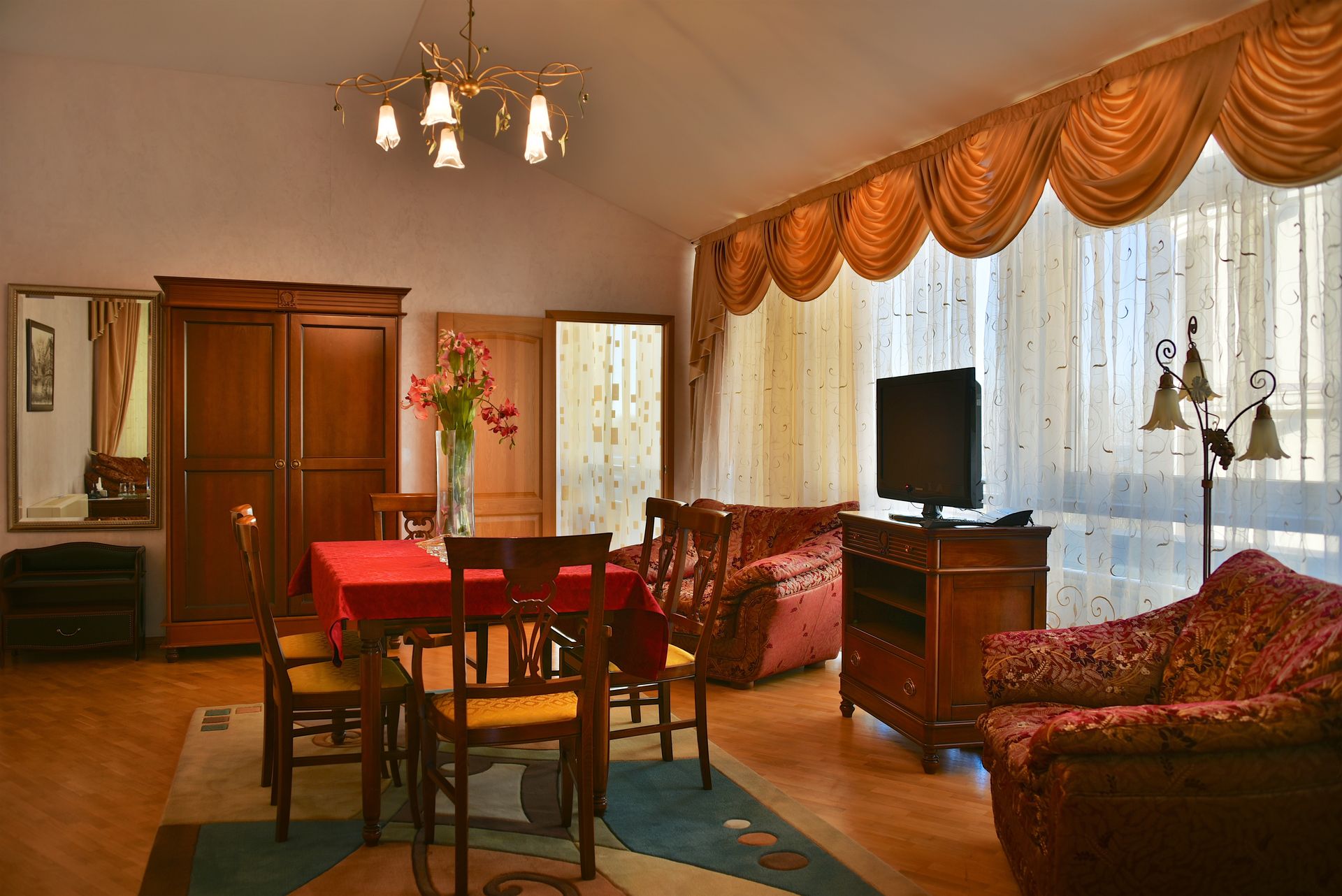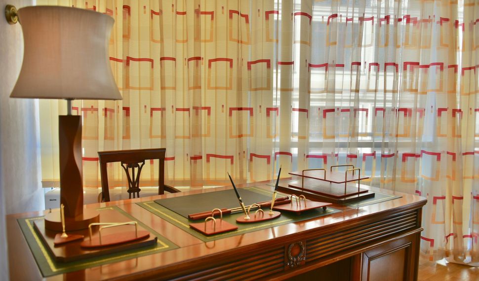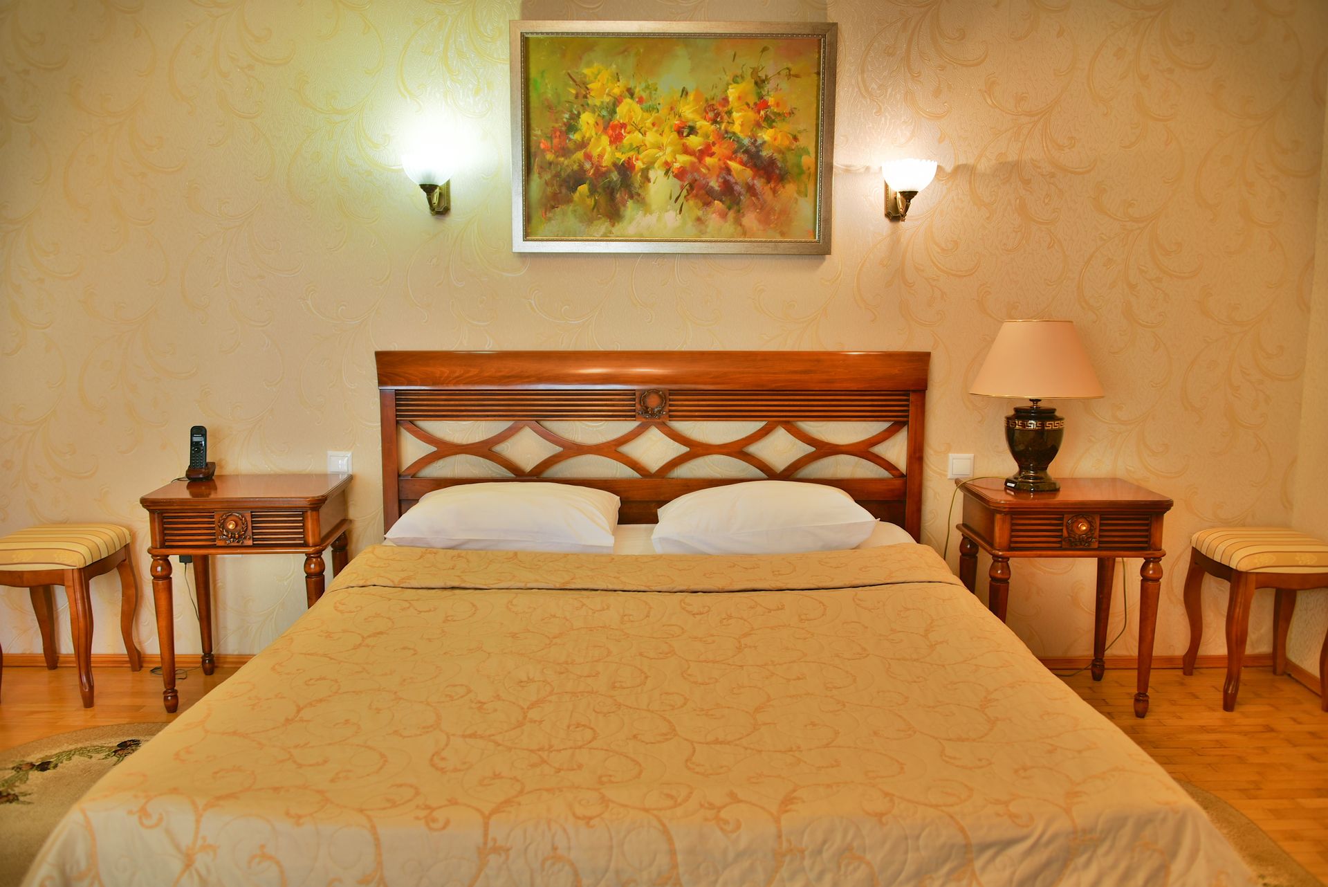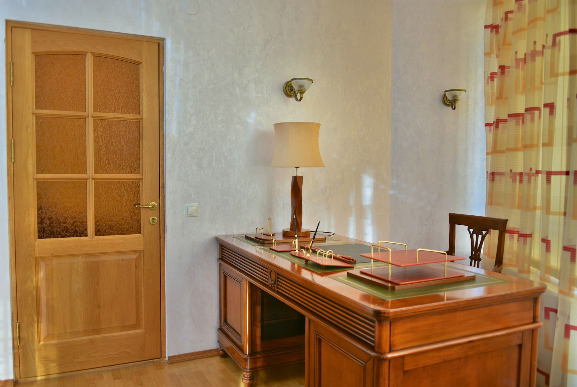 Просторный двухкомнатный номер, оснащен мягкой мебелью. В гостиной: диван и два кресла, журнальный столик, стол со стульями, TV, сейф. В спальной комнате: французская кровать с прикроватными тумбочками, туалетный столик с зеркалом, банкетка, шкаф. Ванная комната: большая ванна, фен, набор косметических средств. В номере имеется кабинет: письменный стол, настольная лампа, стул, шкаф для книг.