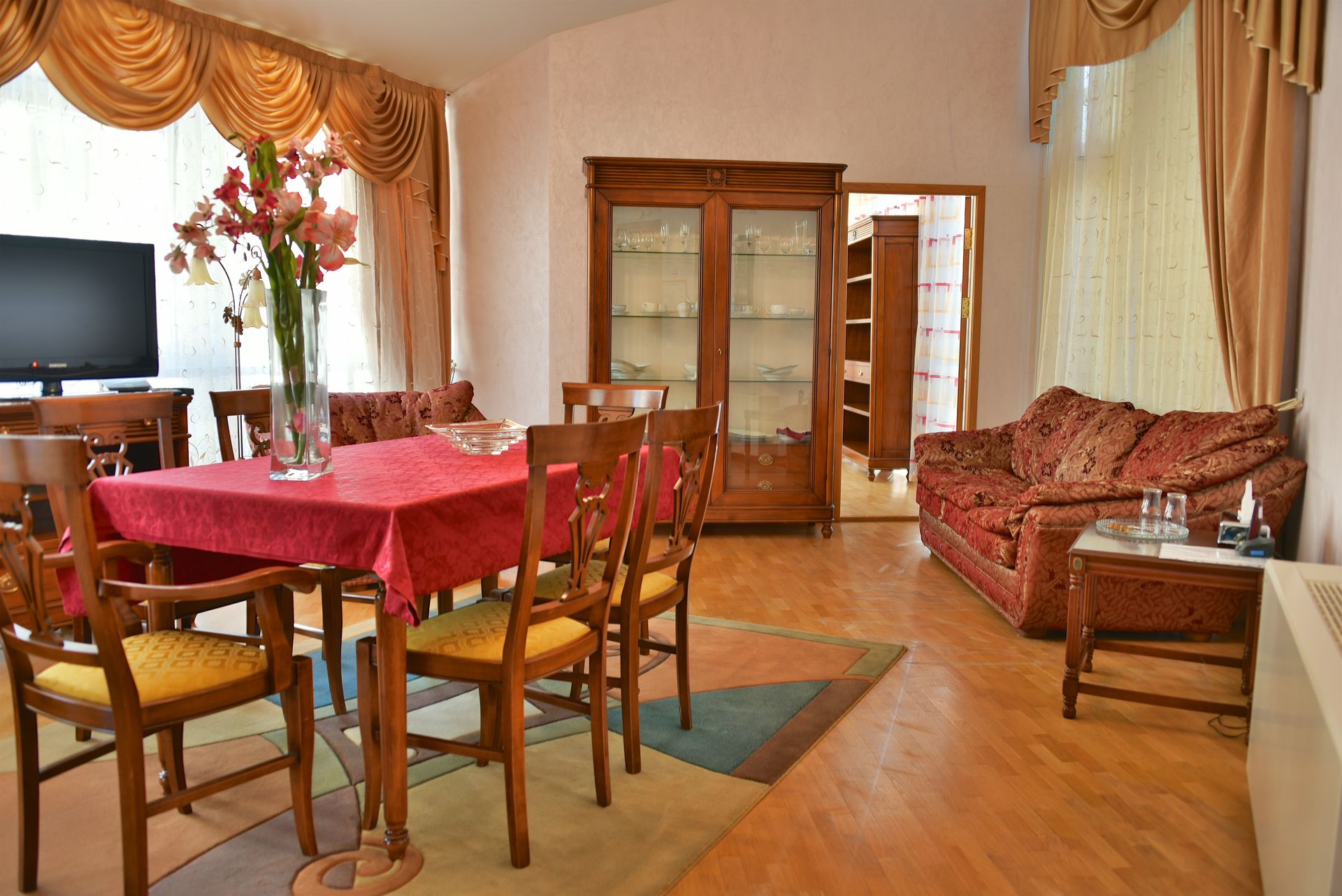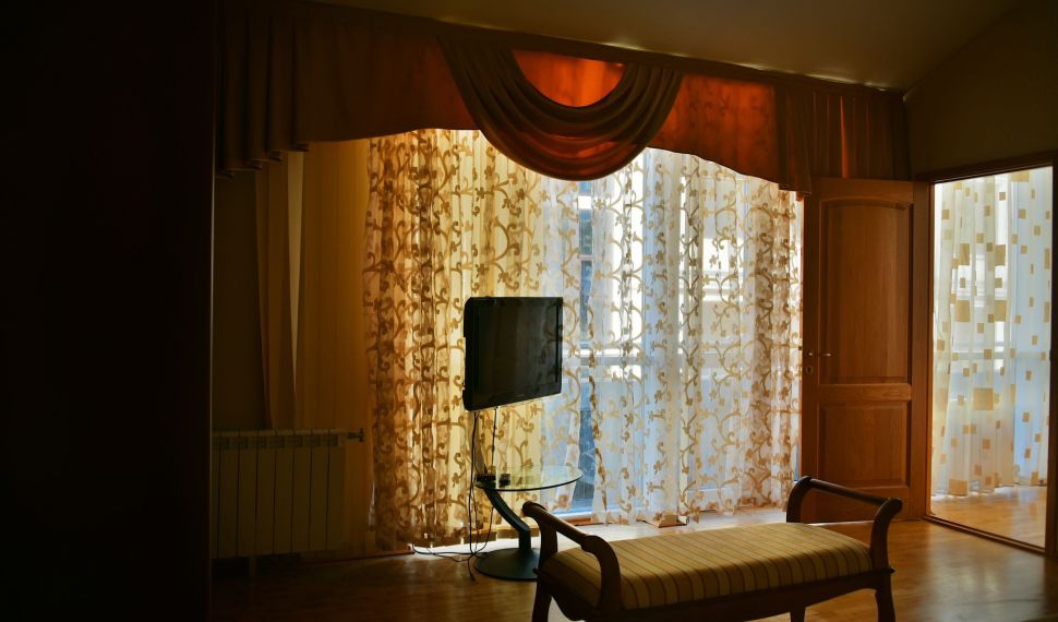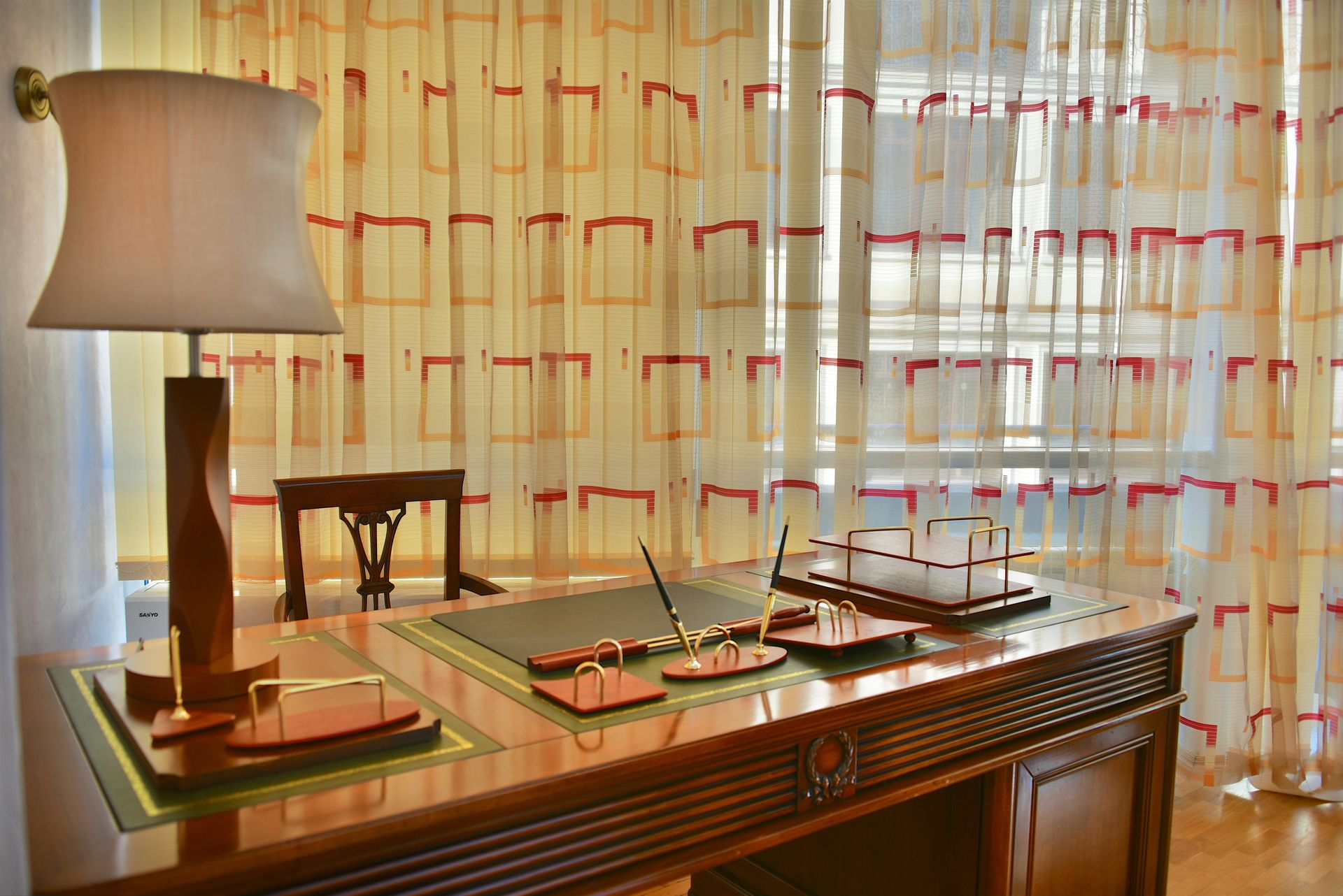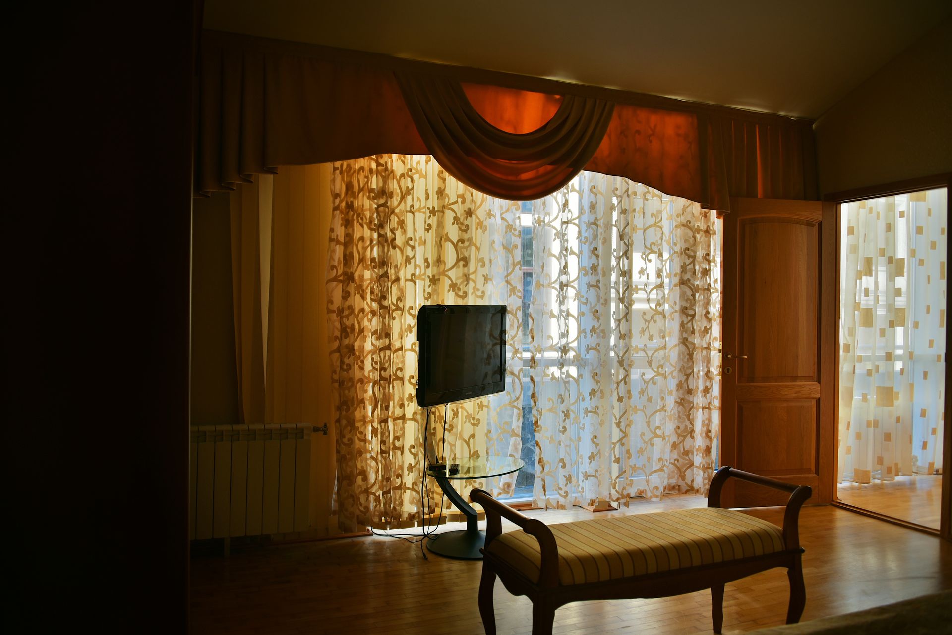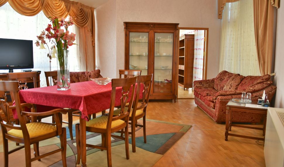 Просторный двухкомнатный номер, оснащен мягкой мебелью. В гостиной: диван и два кресла, журнальный столик, стол со стульями, TV, сейф. В спальной комнате: французская кровать с прикроватными тумбочками, туалетный столик с зеркалом, банкетка, шкаф. Ванная комната: большая ванна, фен, набор косметических средств. В номере имеется кабинет: письменный стол, настольная лампа, стул, шкаф для книг.